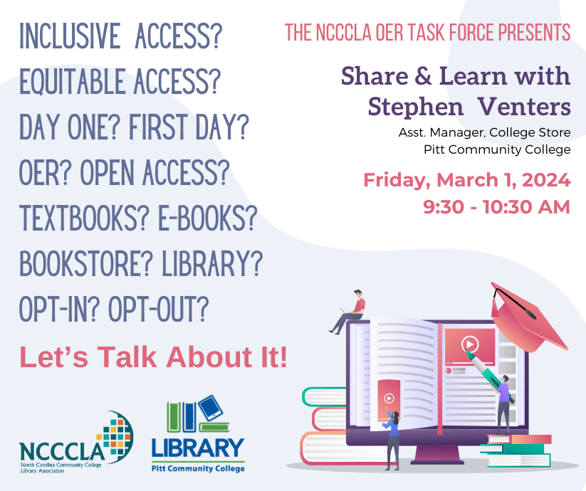 Please join the NCCCLA OER Task Force for our spring 2024 Share & Learn session where our special guest will be Robert “Stephen” Venters. Stephen is the assistant manager at Pitt CC’s Fulford-Rhodes Student Store, and he brings with him years of experience dealing with textbooks, publishers, inclusive access, and everything in-between. The PCC student store is an independent bookstore that fulfills a wide range of curriculum needs in a variety of formats. Stephen will be there to help us, as community college librarians, to get a better handle on the distinctions between inclusive and equitable access, pros and cons of each, and what is making this such a hot topic right now. Bring your questions (and answers!) so that we can share and learn from each other in this very informal and relaxed session.