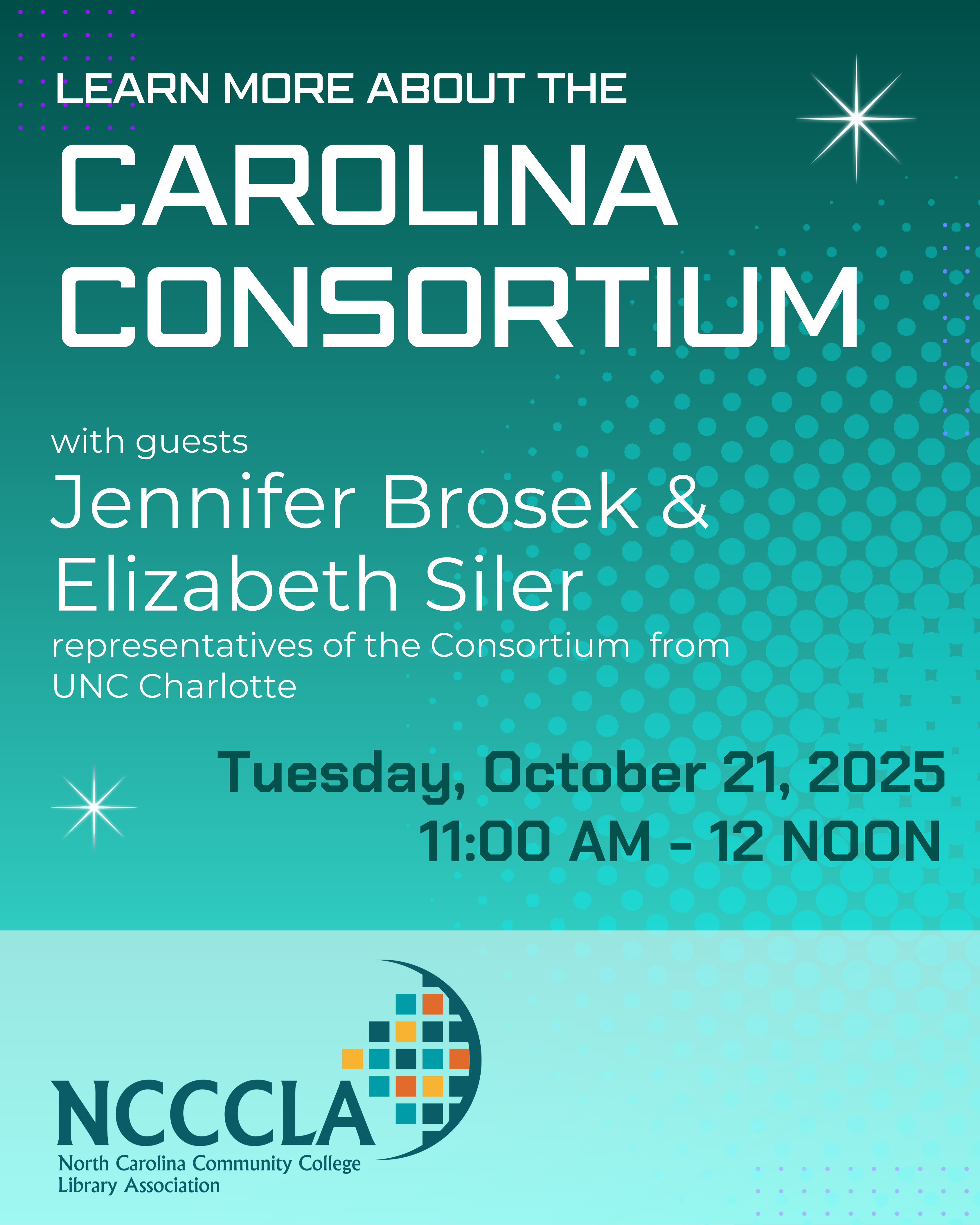 NCCCLA cordially invites you to join us for a virtual information session about the Carolina Consortium to be held on Tuesday, October 21, 2025, at 11 a.m. Guests Jennifer Brosek and Elizabeth Siler, who are representatives of the Consortium from UNC Charlotte will discuss what the Carolina Consortium is, what it does, and ideas for promoting deals of interest to community colleges. There will also be time for Q&As.